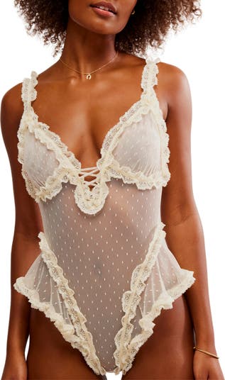 Seductive lace details this ruffle-trimmed bodysuit that does the naughty-and-nice thing perfectly in sheer dotted mesh.