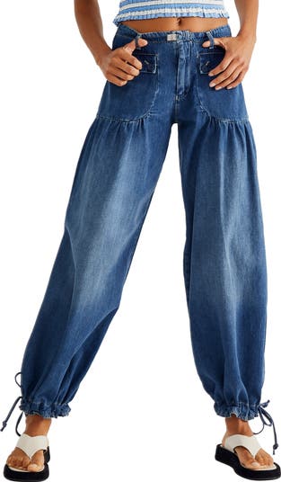 Tied hems put a carefree finish on barrel-style jeans cut from nonstretch denim in a faded indigo wash.