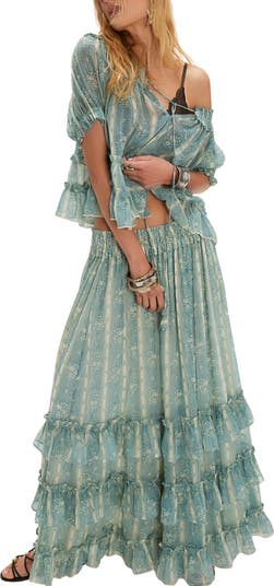 Make room in the music festival lineup for a boho-chic set that features a frill-finished top and a tiered ruffle skirt cut to a trend-right maxi length.