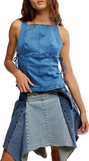 Dainty side ties cinch the silhouette of this denim tank punctuated with a skin-showing scooped back.