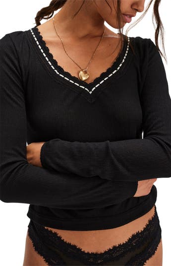Ribbon lace trim highlights the V-neckline of this long-sleeve pajama top made from a semisheer cotton-rich rib.