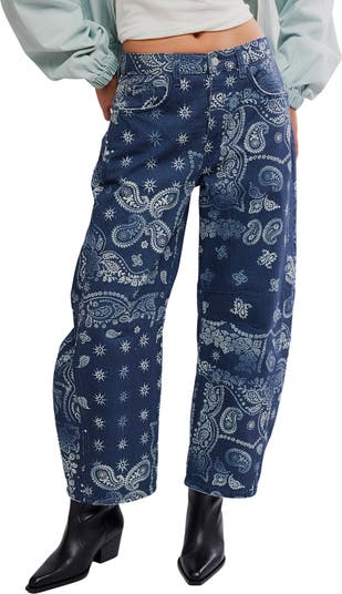 Nonstretch jeans tick off the trends with a wild print and a barrel-leg silhouette.