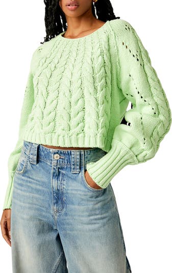 This slouchy, slightly cropped sweater plays with proportion using graduating-scale cabling that flares toward the hem and dramatically drapey sleeves.