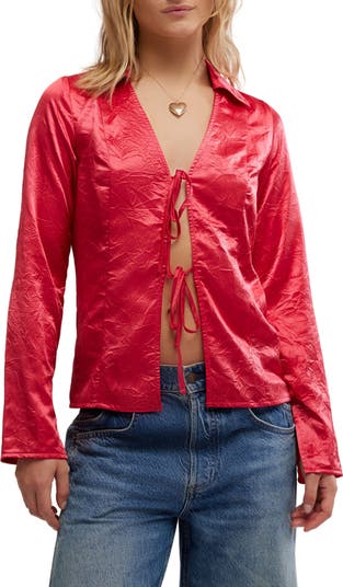 Dainty ties tether the front of this night-out top crafted from glossy crinkled satin.