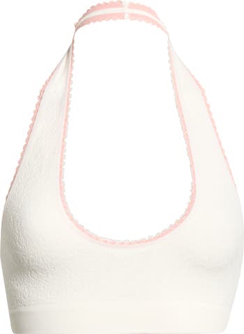 Timelessly textured in a floral jacquard, this soft and effortless stretch-fit bralette is knit in a seamless halter design and edged with airy picot trim.