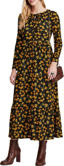 A vivacious floral print makes this long-sleeve dress a sunny style with plenty of prairie charm.