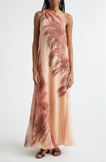 Freedom Palm Print Metallic Silk Crêpe de Chine Maxi Dress