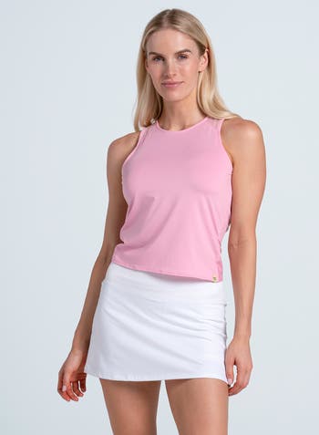Fashion forward with a twist. This paris pink tank has a twist back hemline done in our Hip Fit that’s inspired by the crop top trend but keeps you covered hitting at the high hip. It also features a higher neckline, mesh shoulder panels for added fashion and breathability and is designed to float on the body.