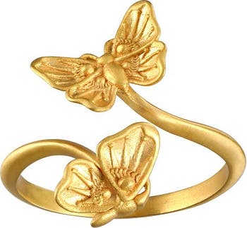 As we evolve into our most authentic selves, we discover the freedom to soar. Two butterflies in 18kt gold plate appear in flight as they shine with delicate detail, creating an adjustable ring symbolizing transformation, hope, and freedom.