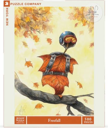 Get ready for a daring autumn adventure with Freefall by Peter de Sève! This 500 piece puzzle captures the whimsical moment of a brave, daredevil leaf plummeting from towering trees, fully embracing the thrill of the season. Each piece brings to life the vibrant colors and playful spirit of fall, making you almost hear the leaf scream, 'Geronimo!' as it takes the plunge