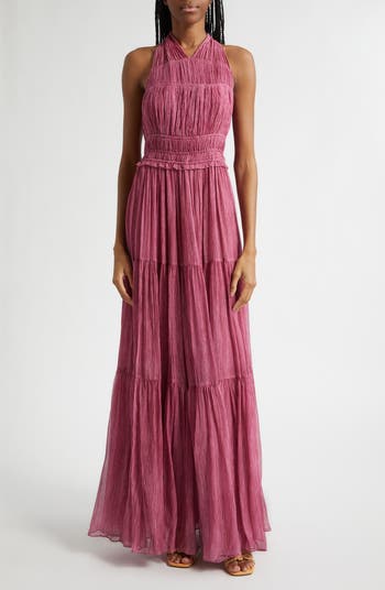 Billowing chiffon gathers into soft texture through this open-back gown designed with a smocked waist and a floor-sweeping tiered skirt.