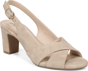 Crisscrossing straps bring subtle dimension to a streamlined slingback sandal featuring a chunky block heel and adjustable buckle closure. Soft System® comfort technology delivers premium underfoot cushioning and a flexible traction sole.