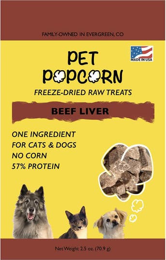 PET POPCORN: FREEZE-DRIED DOG & CAT TREATS - BEEF LIVER - Single Ingredient, All Natural, US-Sourced. SINGLE‑INGREDIENT SIMPLICITY: Made from only one ingredient, our freeze‑dried treats are meticulously crafted with absolutely nothing added, making them ideal for allergy-prone pets and families seeking simplicity and transparency in ingredients. FEEDING: Feed as a treat as necessary. Always supervise your pets while feeding them. Make sure there is water available for them to drink. ABOUT: Freeze-Dried, Raw Treats. Good for Dogs AND Cats. Ingredients: Beef Liver. 57% Protein. Quantity: 2.50 oz = 12 oz Before Freeze-Drying. All natural, no artificial flavors. Use within 30 days of opening. Safe for both dogs and cats. There is no corn in any of our treats - just the one ingredient. Some settling of contents may occur. OUR MISSION: We are committed to providing cats and dogs everywhere with healthy, single-ingredient treats. We strive to offer unique, responsibly-sourced proteins for pets with allergies, sensitive stomachs, or just plain pickiness! We hope to bring joy and excitement to you and your pet's lives through our treats.