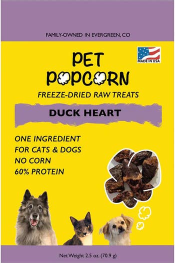 PET POPCORN: FREEZE-DRIED DOG & CAT TREATS - DUCK HEART - Single Ingredient, All Natural, US-Sourced. SINGLE‑INGREDIENT SIMPLICITY: Made from only one ingredient, our freeze‑dried treats are meticulously crafted with absolutely nothing added, making them ideal for allergy-prone pets and families seeking simplicity and transparency in ingredients. FEEDING: Feed as a treat as necessary. Always supervise your pets while feeding them. Make sure there is water available for them to drink. ABOUT: Freeze-Dried, Raw Treats. Good for Dogs AND Cats. Ingredients: Duck Heart. 60% Protein. Quantity: 2.50 oz = 12 oz Before Freeze-Drying. All natural, no artificial flavors. Use within 30 days of opening. Safe for both dogs and cats. There is no corn in any of our treats - just the one ingredient. Some settling of contents may occur. OUR MISSION: We are committed to providing cats and dogs everywhere with healthy, single-ingredient treats. We strive to offer unique, responsibly-sourced proteins for pets with allergies, sensitive stomachs, or just plain pickiness! We hope to bring joy and excitement to you and your pet's lives through our treats.