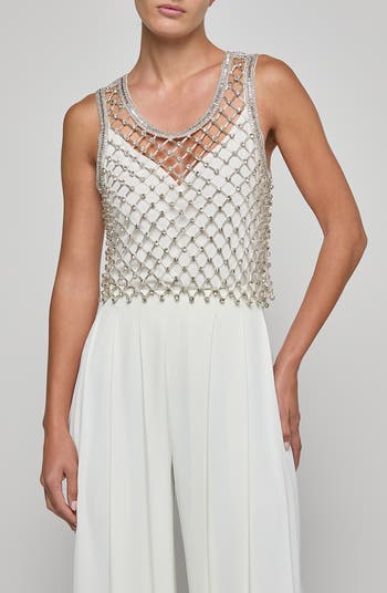 Handcrafted over more than 52 hours, this sheer net crop tank glistens with crystal embellishments and bugle beads arranged in an intricate, light-catching lattice. Sheer by design, it transitions from poolside cover-up to after-dark statement piece.
