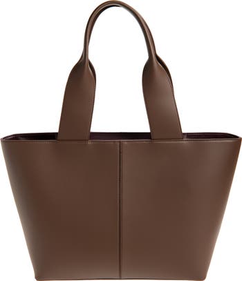 A tapered silhouette and pinched top handles create a clean and comfortable profile on a spacious faux-leather tote designed with ample pockets for organizing your essentials.