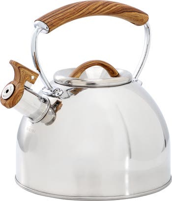 The Mr. Coffee Fremont 2 Quart Mirror Polish Stainless Steel Whistling Tea Kettle combines durability and style, making it a perfect addition to any kitchen. Made from high-quality stainless steel with a sleek mirror polish finish, this kettle features a stay-cool Bakelite handle for safe pouring and a faux wood accent for a touch of elegance. It's compatible with all stovetops, including induction, gas, electric, halogen, and ceramic, ensuring versatility and convenience.Designed for easy use, the flip-up cover spout allows for smooth pouring, while the whistling feature lets you know when the water is ready. With a 2-quart capacity, it's ideal for brewing multiple cups of tea. This kettle is hand wash only to preserve its shine and is not microwave safe. A perfect mix of practicality and sophistication, the Mr. Coffee Fremont Tea Kettle is a must-have for tea lovers.