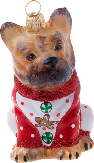 Outfitted for the season in glitter-dusted PJs, this hand-painted glass ornament is the perfect way to pupdate your holiday decor.