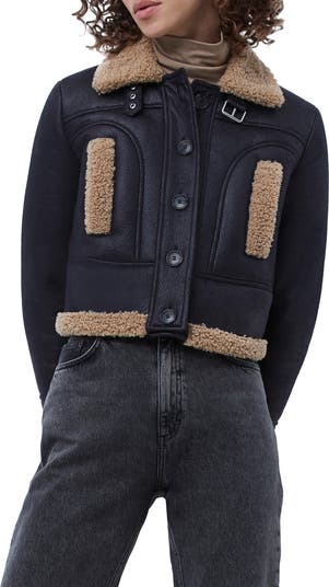 Embrace cool-girl style in this moto-chic cropped jacket designed with a soft faux-shearling lining and trim.