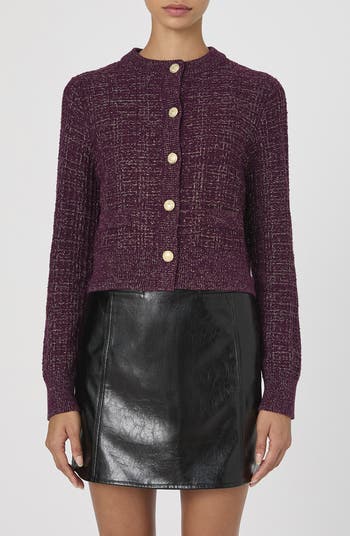 A tweedy stitch textures a polished cardigan fixed with gilded buttons and knit with a simmer of shimmer.