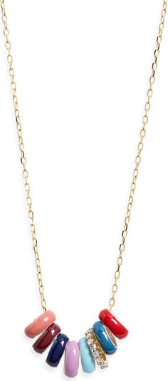 A line of diamonds stands out among enameled ring charms in this 14-karat-gold necklace that mixes playfulness with elegance.