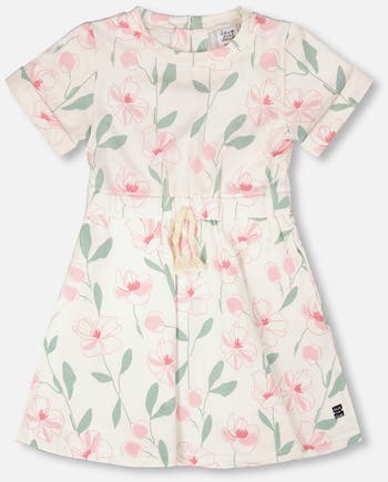 The French terry dress off white with printed flowers is a playful piece with a soft, easy fit. This casual dress features short sleeves, a flowy skirt, an adjustable waist with a drawstring, and a delicate allover floral print. Crafted from a comfortable blend of cotton and elastane, this dress is perfect for everyday wear with a touch of charm.