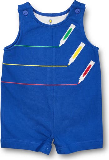 Soft and playful, Florence Eiseman’s French terry shortall features vibrant marker appliqués in primary colors and practical button-shoulder closures. Inseam snaps ensure effortless changing, making it a whimsical yet practical addition to any little one's wardrobe. Machine washable and ready for playtime.