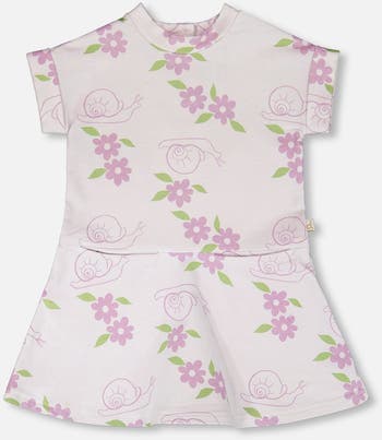Our French terry dress lilac with snails print is a playful choice for sunny days. This casual dress features a t-shirt style top with a round neckline, short sleeves, and an allover snail and flower pattern in lilac hues. Finished with front pockets, a flowy skirt and a comfortable fit, it’s perfect for girls on everyday adventures.