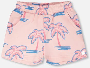 Our French terry shorts light pink with palm print are a playful piece for warm days. These bottoms feature an elastic waistband, slant pockets, and a straight cut that ensures comfort and ease of movement. Adorned with an allover palm tree motif, they’re a fun choice for girls, easy to coordinate with tops and sweaters from our "Blue Horizon" collection.