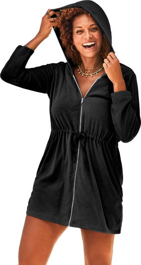 Super-flattering hoodie drawstring cover-up perfect for lounging poolside or strolling the boardwalk.