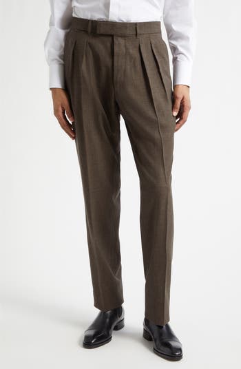 Double knife pleats bring old-school detailing plus a touch of extra room to dress pants that sit just below the waist and stay comfortably roomy down the legs to maintain a classic profile. Tailored from a blend of mohair, wool and linen in a slubbed weave, they work well with casual or semiformal looks.