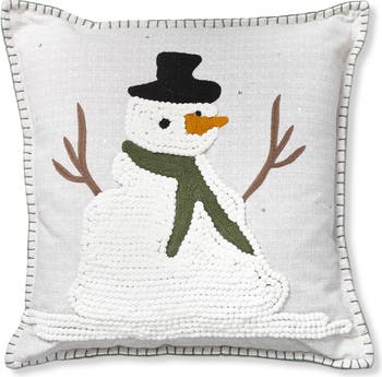 - Fresh Balsam Snowman Throw Pillow is 18x18 inches made of multicolor cotton featuring a festive design with hand screen printed textured weave and embroidery with sequins.