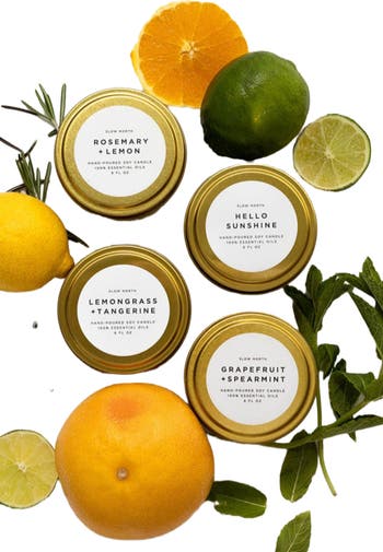 Refresh the senses with the invigorating scents of the Fresh Collection The Fresh Collection box is perfect for anyone who loves clean, citrus scents. This 4-pack contains four travel tin candles, each with a unique essential oil blend handcrafted by Slow North. Hello Sunshine is playful and refreshing; with a bright citrus aroma and a soothing, floral undertone. Ingredients: Grapefruit Essential Oil, Geranium Essential Oil, Lime Essential Oil, and Soy Wax Grapefruit + Spearmint is uplifting and energizing; with a bright and refreshing mint finish. Ingredients: Grapefruit Essential Oil, Spearmint Essential Oil, and Soy Wax Lemongrass + Tangerine is sweet and energetic; with a bold citrus aroma. Ingredients: Lemongrass Essential Oil, Tangerine Essential Oil, and Soy Wax Rosemary + Lemon is sweet and herbal; with a crisp and clean scent.
