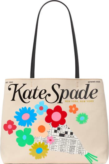 Add a flower-powered pop of color to your ensemble with this spacious canvas tote boasting a magazine-inspired design featuring a partially filled-out crossword puzzle.