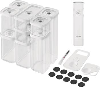 Includes: Two M containers, two 2M containers, on S container, two 2S containers, one 3S container, one 4S container, one S insert, one M insert, one vacuum pump and one label set.