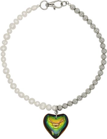 Freshwater Pearl And Steel Bead Necklace With Heart Charm designed to elevate everyday style. This necklace blends natural freshwater pearls with stainless steel beads for a sleek, modern look. Designed and assembled in Los Angeles from imported parts.