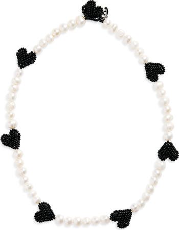 Luminous freshwater pearls contrast with beaded black heart stations on this handcrafted necklace that's both whimsical and elegant.