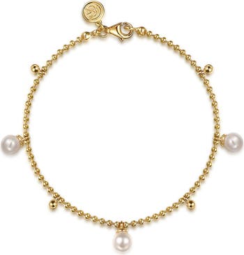 Lustrous freshwater pearl charms dangle from this beaded 14-karat gold bracelet that radiates organic opulence.
