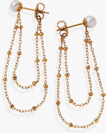 Add a luminous touch to any look with these Freshwater Pearl Front-and-Back Earrings. They feature genuine freshwater pearls on post earrings, with delicate layered chains that hang down from the pearl, go around the ear lobe, and attach to the back of the post. Wear them for an unmatched glow.