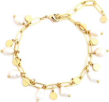 Freshwater pearls and coin charms add a extra luster and gleam to this paper-clip chain bracelet.