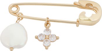 A lustrous freshwater pearl and faceted crystal flower dangle from a 14-karat gold plated pin with luminous shine.