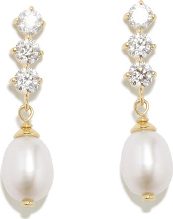 These glamorous drop earrings feature round-cut cubic zirconia partnered with luminous freshwater pearls, creating an exquisite play light with every turn of your head.