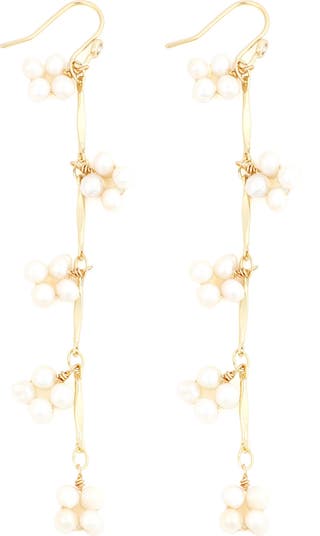 These linear drop earrings are studded with clusters of freshwater pearls arranged like buds along a branch. The organic silhouette creates soft movement and a refined, nature-inspired glow.