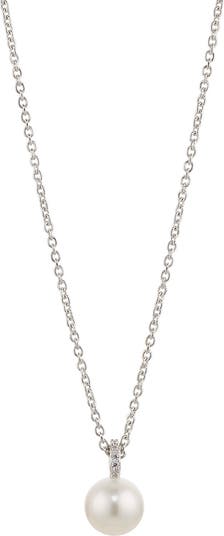Pavé cubic zirconia sparkle at the bail of this timeless freshwater pearl pendant necklace hand polished to perfection.