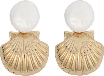 Freshwater pearls top shells in these beachy drop earrings beaming with sunny 14-karat-gold plating.