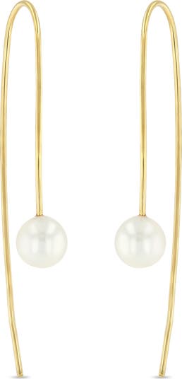 A thread-through design gives a sleek silhouette to 14-karat-gold earrings that are anchored with freshwater pearls.