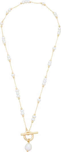 Bring organic highlight and luster to your ensemble with this freshwater pearl necklace plated in 18-karat gold and anchored with a front toggle.