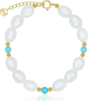 Complete your look with the timeless elegance of this dainty bracelet embellished with freshwater pearls and vivid turquoise stones.