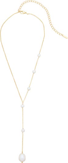 Freshwater pearl stations bring asymmetric luster to this drapey Y-necklace plated in tarnish-resistant 18-karat gold.