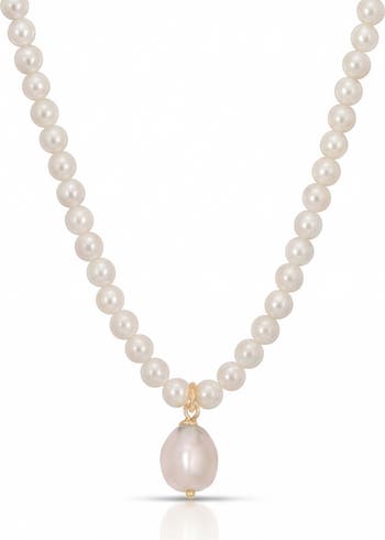 This dreamy necklace adds a rich glow to your neckline with its smooth white beads and freshwater-pearl pendant.